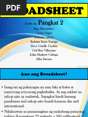 Ang unang punto na dapat nating bigyang pansin ay ang laki ng papel. BROADSHEET ang pinakamalaking pormat ng pahayagan nailalarawan sa pamamagitan ng mahabang patayong mga pahina karaniwang 22 pulgada o 560 millimeters ang target readers ay mga Class A at B 7. Ang isang pahayagan ng broadsheet ay nauugnay sa malubhang pamamahayag higit pa kaysa sa mas maliit na pinsan nito ang tabloid.