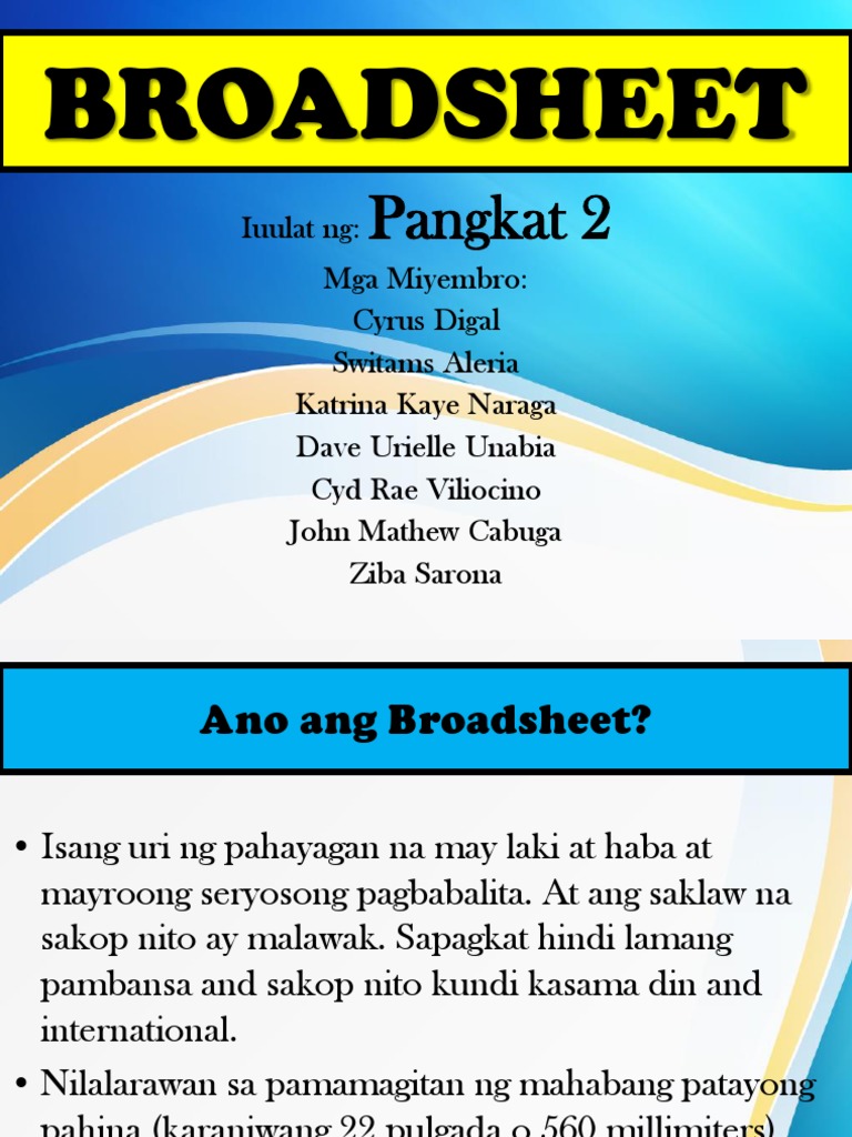 Sinasabi na ang broadsheet ay ang mga taong may pinag-aralan o nakatataas sa lipunan ang. Ang isang broadsheet ay normal na 11-12 20 pulgada ang laki. Ano ang pagkakaiba ng tabloid at broadsheet.