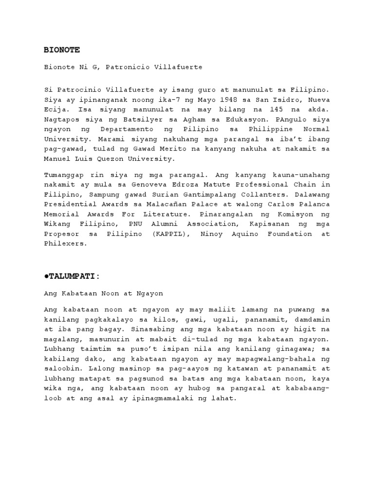 A isang mataas na pangungusap m aaringmakalimutan ng nagbabasa ang mga impormasyon tungkol sa awtor. Bionote Ni G Patronicio Villafuerte. Download as DOCX PDF TXT or read online from Scribd.