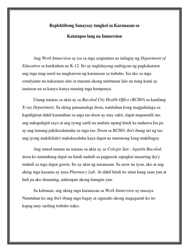 Replektibong Sanaysay Tungkol Sa Karanasan Sa Katatapos Lang Na Work Immersion