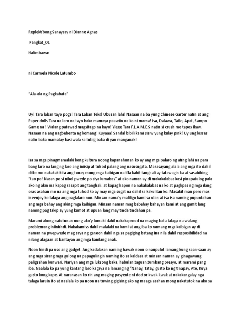 Halimbawa ng replektibong sanaysay. Ang replektibong sanaysay ay opinyonado at nagbibigay ng kalayaan sa may-akda na isulat ang kanilang opinyon at. Ayon sa natalakay ang replektibong sanaysay ay nanganngahulugang pag-uulit o pagbabalik tanaw maaaring sa ating napanood o nabasaSa pamamagitan nito ay nagkakaroon tayo ng repleksyon at naibabahagi natin ang sariling karanasan o opimyon sa ibaNaibabahagi rin natin ang ating kaalaman o pananaw at damdamin ukol sa nabasa o napanoodKung mimsan pa ngay. Replektibong Sanaysay Gaano Kahirap Lumaki na Malayo sa Magulang OFW.