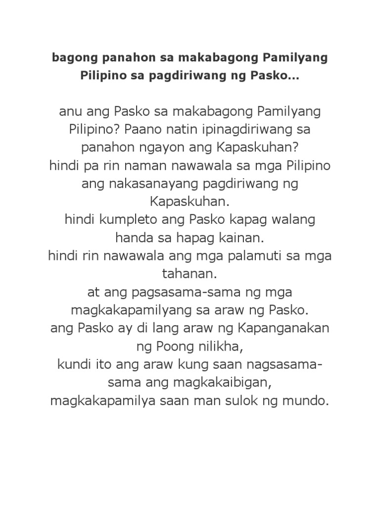 Bagamat paulit-ulit na ipinapatugtog ito ng ilan sa atin ay hindi pa rin pinagsasawaan nating mga Pilipino ang mga Awiting Pamasko. Para sa akin ang araw ng pasko ay araw ng pagbibigayan. 2 Unlock answers.
